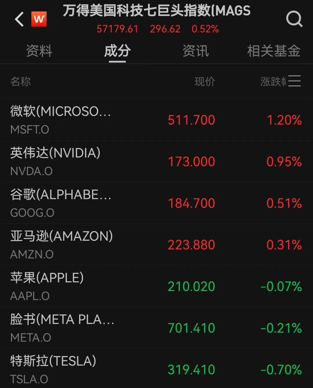 萬得美國科技七巨頭指數(shù)漲0.52%。微軟漲超1%,英偉達(dá)漲近1%,兩家公司股價續(xù)創(chuàng)歷史新高。