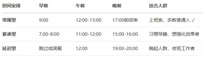 “16 + 8飲食”是每天只在8小時內(nèi)進食,其余16小時僅能喝水或無熱量飲品(如黑咖啡、淡茶)。以下是三種常用時間窗口,你可根據(jù)生活節(jié)奏選擇,最推薦的是“常規(guī)型”,即9:00~17:00。