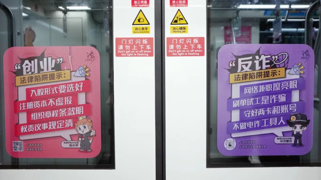 一踏入車廂,四位可愛的IP形象就在車門上迎接你啦!他們分別是楊浦法院“楊小知”、楊浦公安小冷警官、楊浦交警倪嘉輝、楊浦律師“楊小律”,都是身懷絕技的“法律守護(hù)神”,將大家關(guān)心的就業(yè)、創(chuàng)業(yè)、反詐、交通安全等方面的法律知識轉(zhuǎn)化為朗朗上口的順口溜,為乘客提供實用的法律提示。