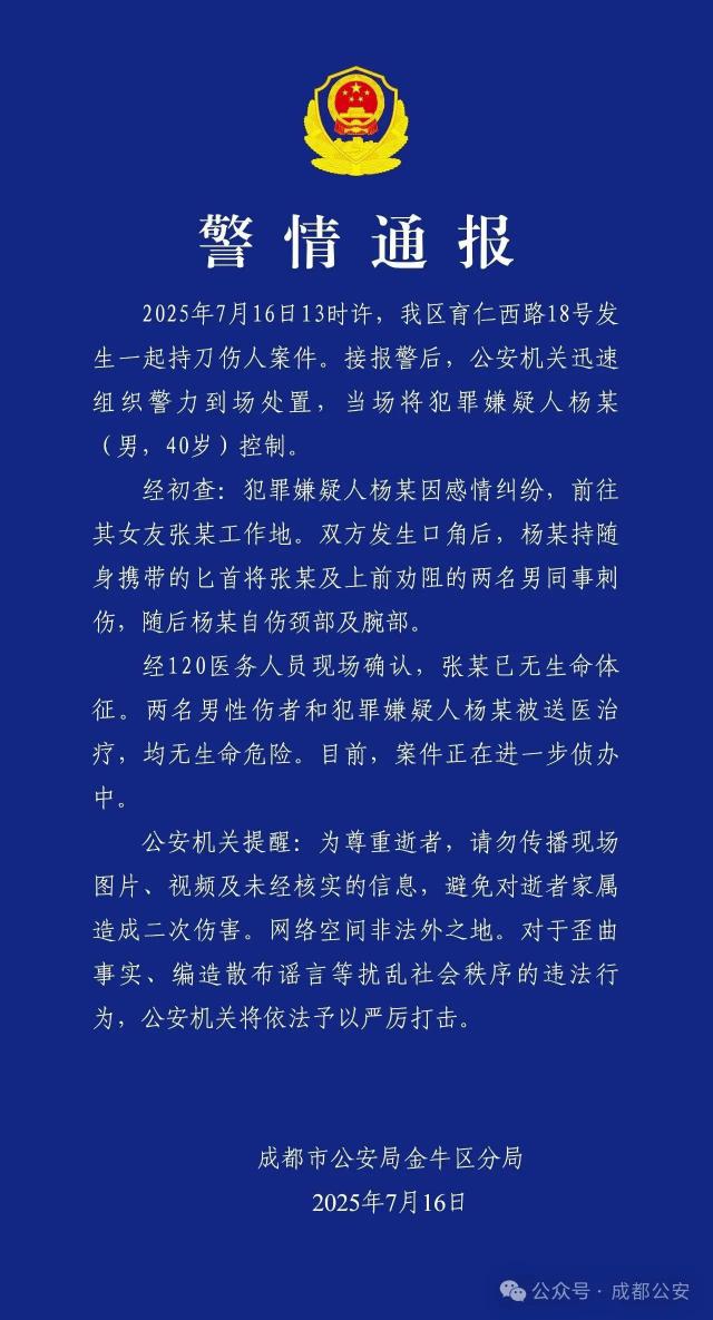 2025年7月16日13時左右,金牛區(qū)育仁西路18號發(fā)生一起持刀傷人案件。接到報警后,公安機(jī)關(guān)迅速組織警力趕到現(xiàn)場處置,當(dāng)場控制了犯罪嫌疑人楊某(男,40歲)。