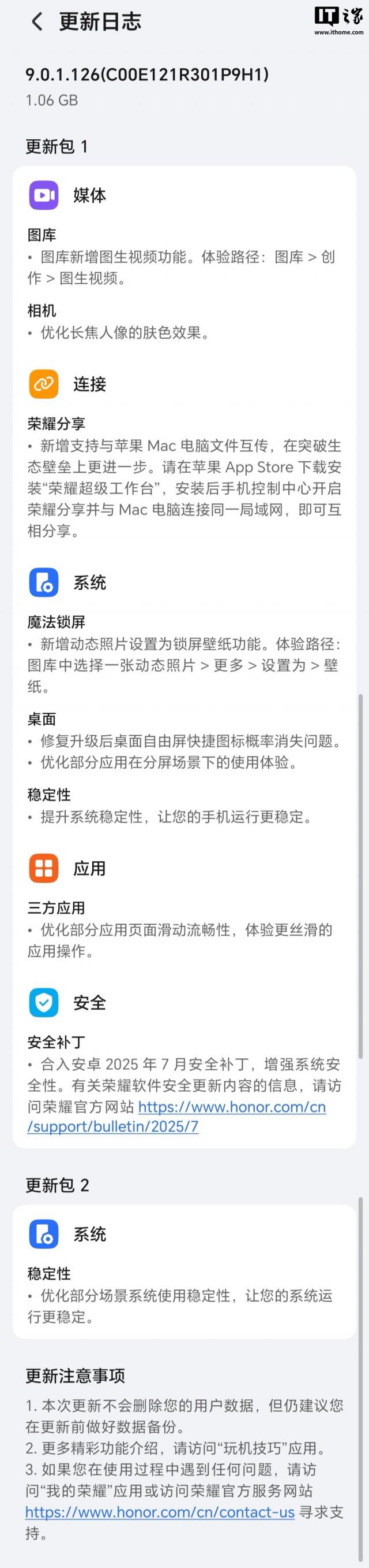 IT之家7月18日消息,榮耀Magic V5折疊屏手機(jī)現(xiàn)已推送9.0.1.126系統(tǒng)更新,安裝包體積為1.06GB,此次更新主要帶來了圖庫新增圖生視頻功能、榮耀分享新增與蘋果Mac電腦文件互傳等亮點(diǎn)。