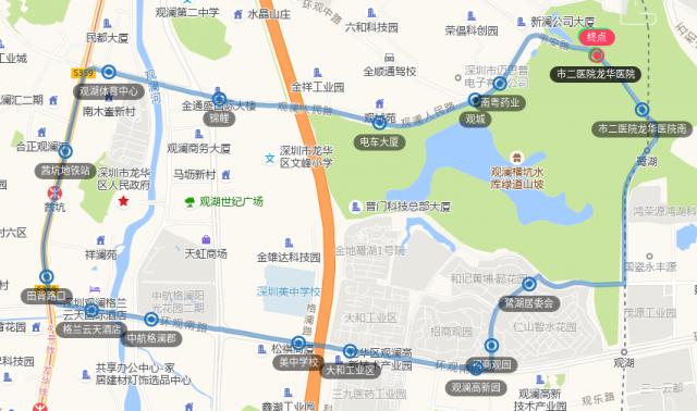 市二醫(yī)院龍華醫(yī)院、市二醫(yī)院龍華醫(yī)院南、鷺湖居委會、招商觀園、觀瀾高新園、大和工業(yè)區(qū)、美中學(xué)校、中航格瀾郡、格蘭云天酒店、田背路口、茜坑地鐵站、觀湖體育中心、錦鯉、電車大廈、觀城、南粵藥業(yè)、市二醫(yī)院龍華醫(yī)院