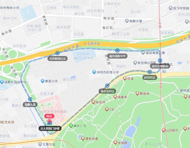 北大醫(yī)院門診樓、京鵬大廈、北環(huán)新洲立交、福田創(chuàng)新中學(xué)、蓮花北地鐵站、彩田村②、蓮花北村①、北大醫(yī)院門診樓