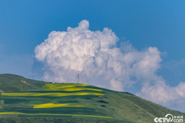 在青海海北州,油菜花與積雪同框。山頂上種植的油菜花在藍(lán)天白云的映襯下宛如油畫(huà)一般。