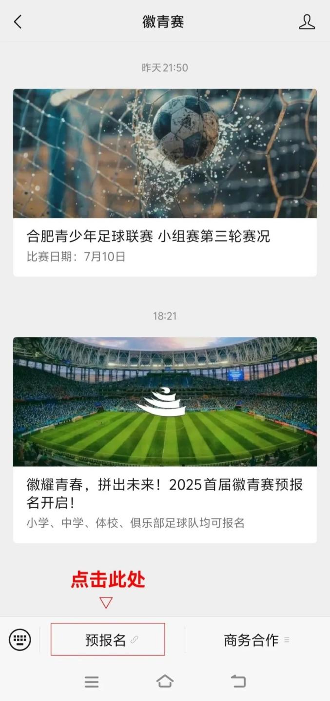 報名方式是以隊伍名義報名,體校代表隊、學(xué)校代表隊、社會青訓(xùn)機構(gòu)、俱樂部均可報名。由參賽隊領(lǐng)隊掃描下方二維碼,關(guān)注“徽青賽”微信公眾號,點擊公眾號下方菜單欄“預(yù)報名”進行報名。報名時填寫參賽隊伍和參加組別,提供相關(guān)證明材料照片,隊員和其他信息待正式報名時再填寫。參與預(yù)報名的單位優(yōu)先參加縣(市、區(qū))級聯(lián)賽。
