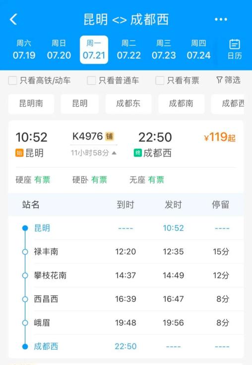 昆明→成都西的K4976次列車從昆明站始發(fā),全程運(yùn)行11小時58分,途經(jīng)祿豐南、攀枝花南、西昌西、峨眉,終到成都西站。