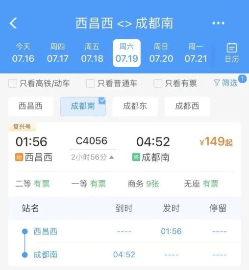 C4060次列車從西昌西站始發(fā),全程運(yùn)行2小時57分,一站直達(dá)成都南站。