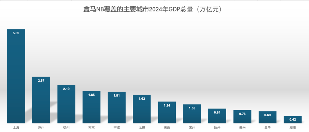 值得注意的是,目前盒馬NB開店最多的三座城市,2024年GDP總量均超2萬億人民幣,也是其進(jìn)駐城市中GDP最高的三座。此外,除上海、杭州、蘇州外,盒馬NB還進(jìn)駐了南京、寧波、無錫、南通和常州五座2024年GDP總量破萬億的城市。