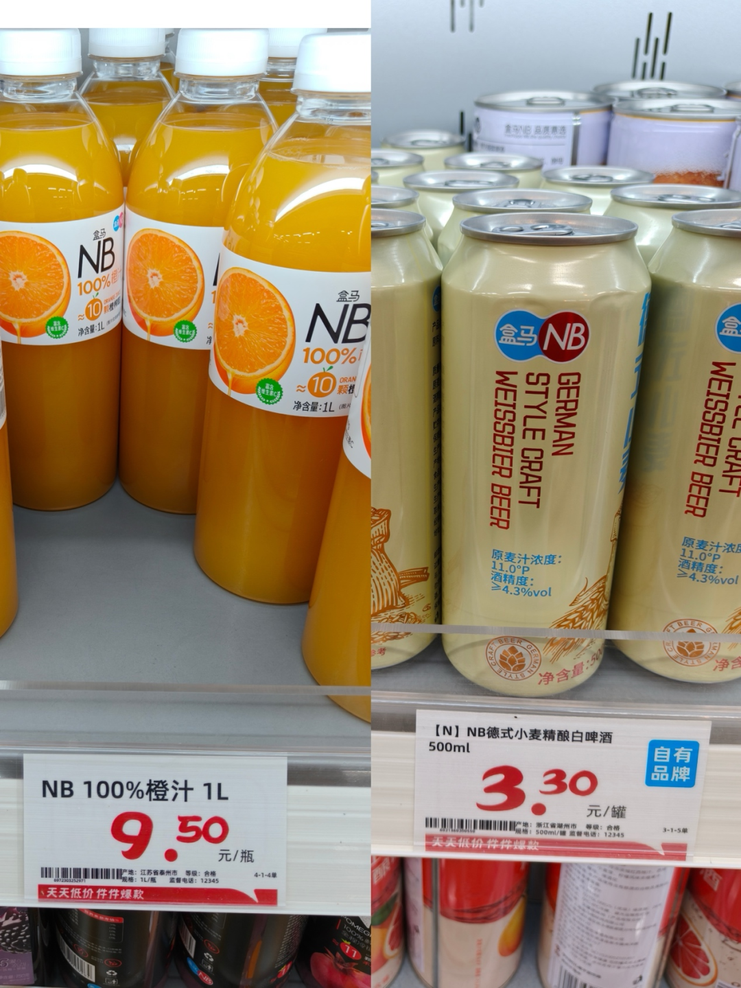 比如盒馬NB自營的100%鮮橙汁1L售價9.5元,而胖東來的100%橙汁1L售價13.5元;盒馬NB自營的德式小麥精釀啤酒500ml單價約3.3元,胖東來的小麥精釀啤酒500ml單價約為3.5元。
