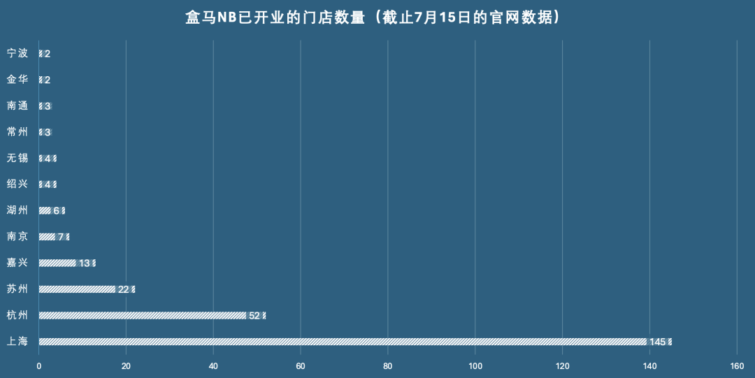 截至7月15日官網(wǎng)數(shù)據(jù),盒馬NB已開業(yè)門店數(shù)達(dá)263家,分布在上海、蘇州、南京、無錫、常州、南通、杭州、嘉興、湖州、紹興、金華和寧波12座城市。