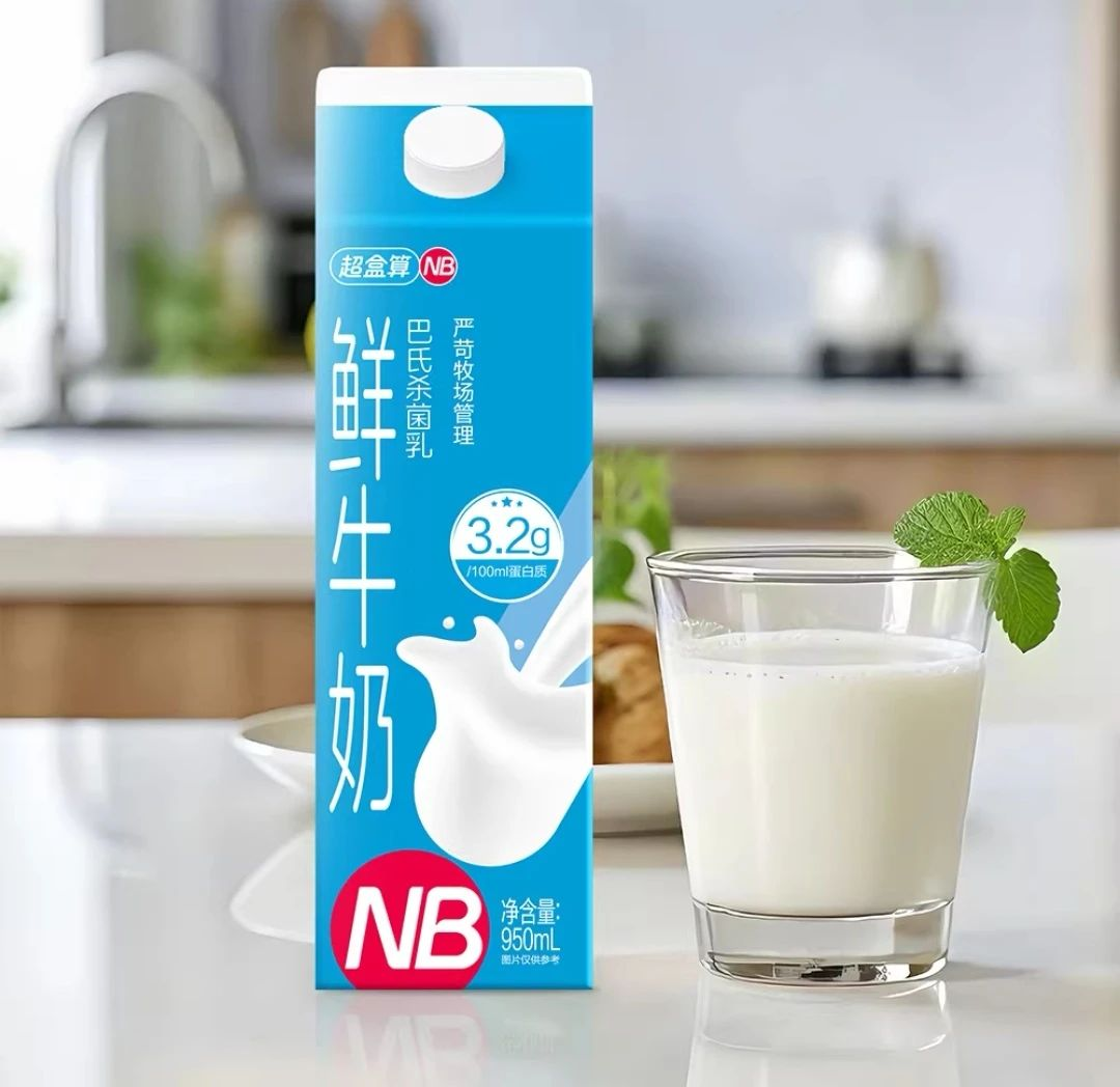 目前已更換新LOGO的NB自營低溫鮮牛奶,950ml裝僅售價7.5元,低于市面上主流品牌低溫鮮牛奶的價格。