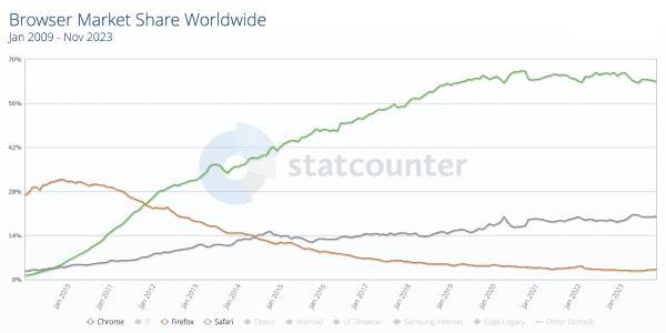 火狐的成功秘訣,可以簡(jiǎn)單總結(jié)成用戶至上。其建立開源社區(qū),允許用戶通過擴(kuò)展定制瀏覽器功能,各種Firebug等神級(jí)插件也是帶來了不少震撼。到2009年的時(shí)候,火狐市場(chǎng)份額就達(dá)到了31.56% 的巔峰,后面月活躍用戶一度高達(dá)2.44億。