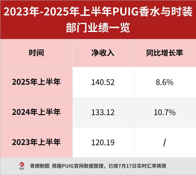 香水和時(shí)裝一直是PUIG集團(tuán)的核心業(yè)務(wù)。2025年上半年財(cái)報(bào)顯示,該部門凈收入達(dá)16.85億歐元(約合人民幣140.52億元),同比增長(zhǎng)8.6%,占集團(tuán)整體收入的73%。