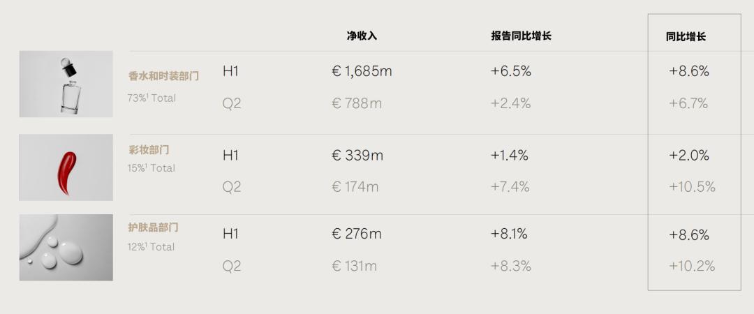 值得關(guān)注的是,該集團(tuán)上半年各部門、各地區(qū)均實(shí)現(xiàn)正增長(zhǎng)。其中,中國(guó)所在的亞太地區(qū)同比增長(zhǎng)16.5%,是增幅最大的地區(qū)。香水與時(shí)裝作為集團(tuán)最大業(yè)務(wù)部門,上半年凈收入16.85億歐元(約合人民幣140.52億元),也實(shí)現(xiàn)了增長(zhǎng)。