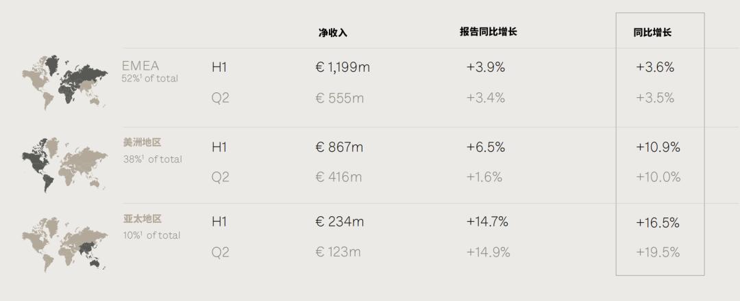 其中,第二季度,EMEA地區(qū)凈收入5.55億歐元(約合人民幣46.31億元),凈收入增長(zhǎng)率為3.5%。Marc puig在電話會(huì)議中表示:“EMEA地區(qū)業(yè)績(jī)表現(xiàn)不一,法國(guó)等市場(chǎng)仍較疲軟。”