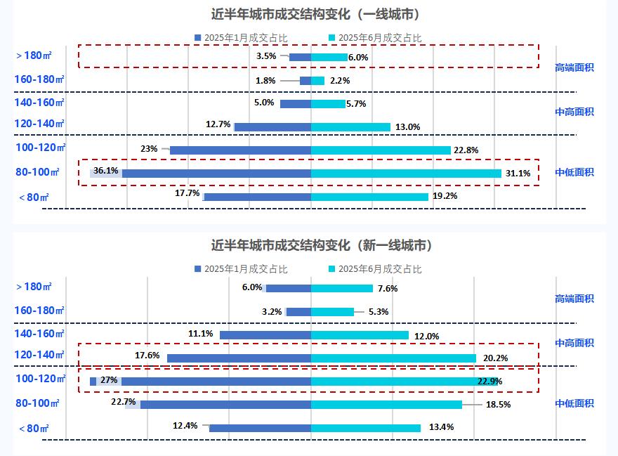 這種局面加速了新房市場(chǎng)改善高端化走向。上半年,一線城市180㎡以上產(chǎn)品同比提升約3%,新一線城市120 - 140㎡產(chǎn)品也上漲3%。