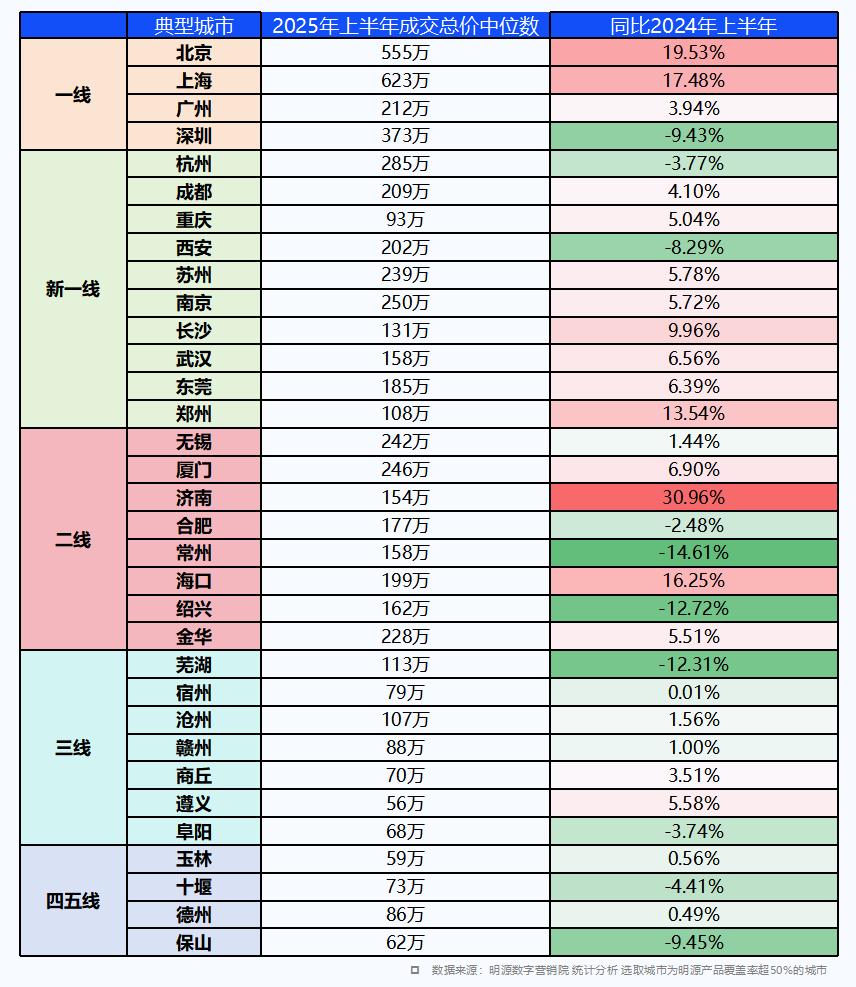 明源數(shù)字營(yíng)銷院數(shù)據(jù)顯示,一線、新一線、強(qiáng)二線城市成交總價(jià)中位數(shù)較去年上漲,平均漲幅5 - 20%不等,北京上海漲幅最高,達(dá)17 - 20%。而三四線城市相較去年持平或下滑,部分城市下滑幅度約10%。