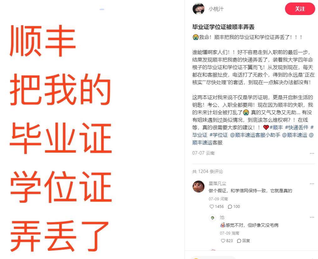 7月7日,有網(wǎng)友發(fā)帖稱,順豐寄丟了畢業(yè)證和學(xué)位證,從發(fā)現(xiàn)問題到發(fā)帖,一直在和客服拉扯,無數(shù)個電話得到的永遠是“正在核實”“盡快處理”的套話回復(fù),沒有有效的解決辦法。