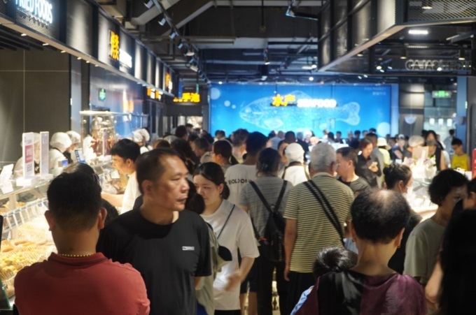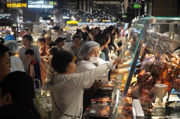 熟食區(qū)升級(jí)顯著,透明廚房讓烹飪過程一目了然,新增的早餐、夜宵、家庭聚餐等場(chǎng)景化產(chǎn)品豐富多樣。江西本土鹵味品牌“煌上煌”的鴨脖、鴨翅等產(chǎn)品占據(jù)顯眼位置。