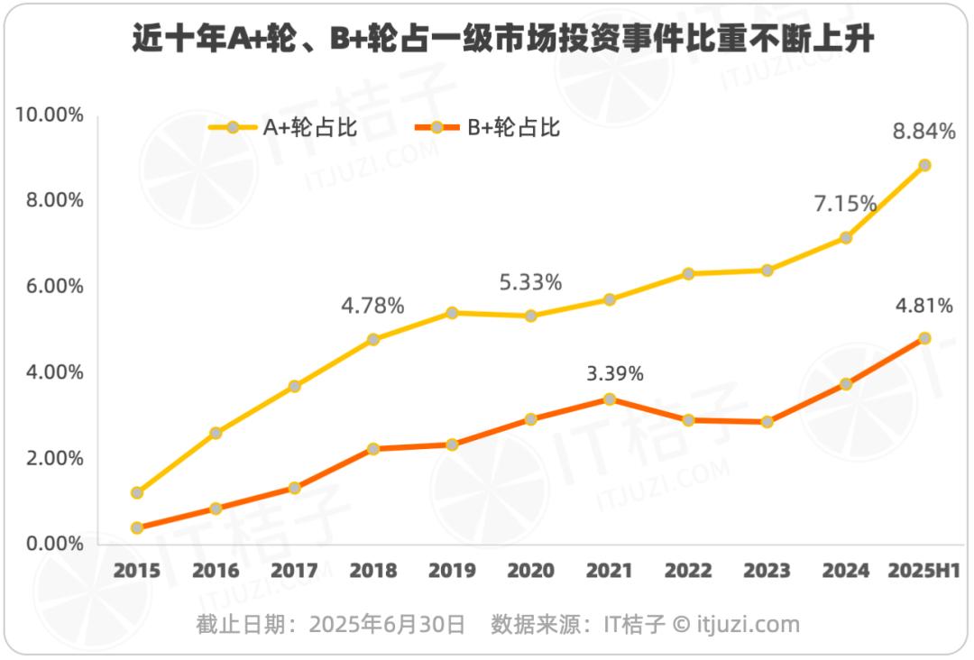 B+輪投資事件在2015年發(fā)生41筆,占比僅0.39%;2024年發(fā)生213筆,占比3.74%。2025年上半年國(guó)內(nèi)B+輪事件有180筆,同比增加了49%,在總體的占比提升為4.81%。