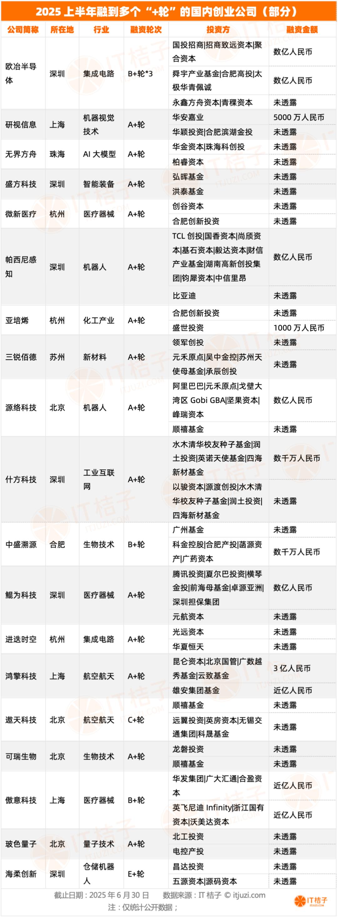 據(jù)IT桔子統(tǒng)計(jì),2025年上半年,一共有571家公司獲得「+輪」次投資,涉及總金額約404.34億元。其中,至少19家公司獲得兩次及以上「+輪」次投資。