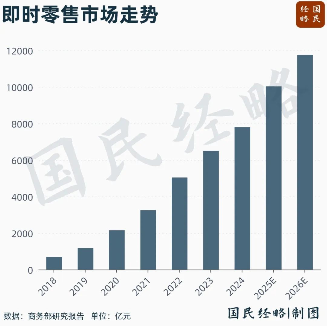 據(jù)商務(wù)部報告,預(yù)計2025年即時零售突破1萬億規(guī)模,2030年有望達(dá)到2萬億,年化增長15%以上。