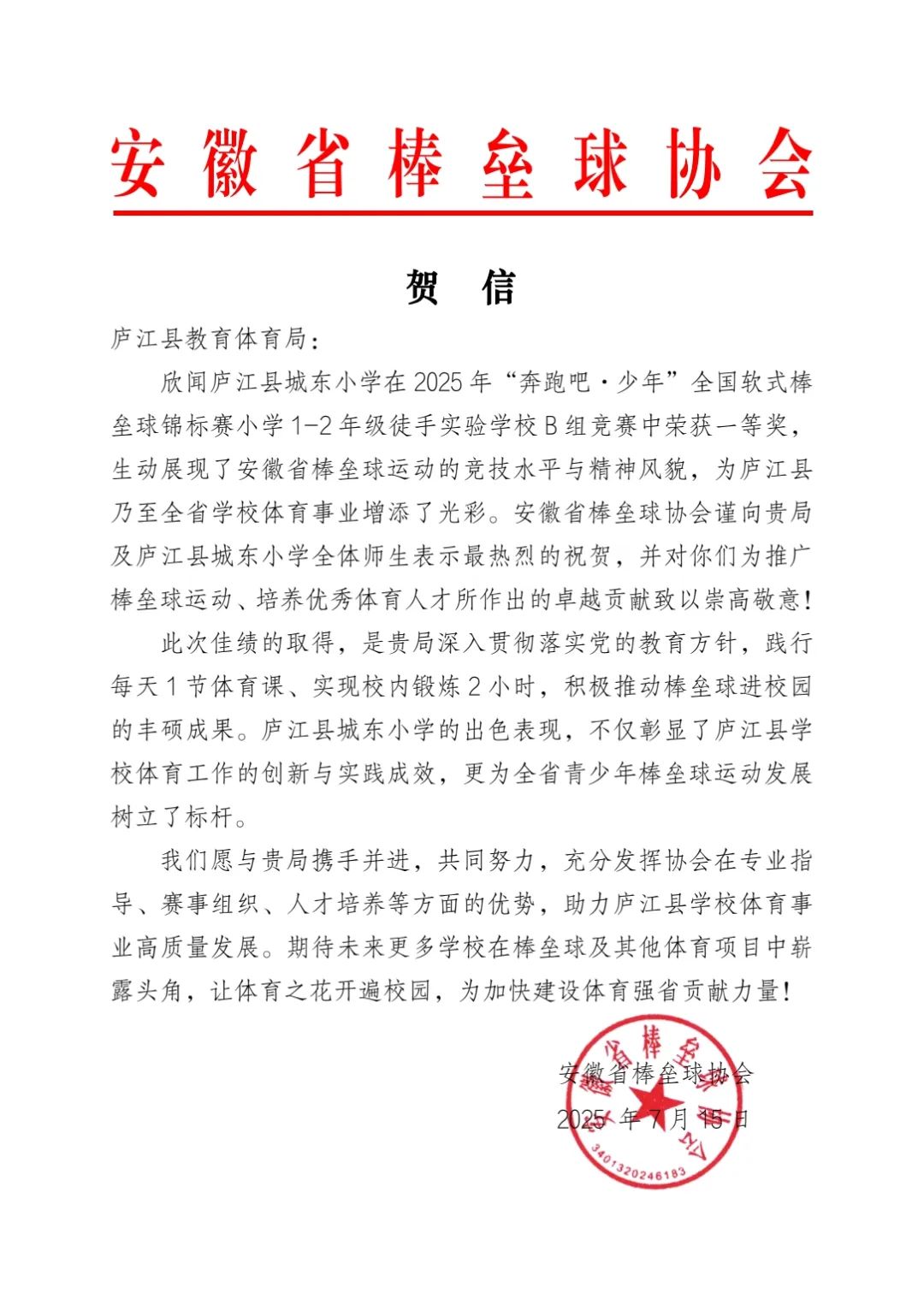 在本次比賽中,廬江縣城東小學代表隊不懼強敵,配合默契,表現(xiàn)出色。他們每一次擊球、跑壘都全力以赴,在眾多強隊中脫穎而出,榮獲2025年全國軟式棒壘球錦標賽小學1 - 2年級徒手實驗學校B組一等獎。