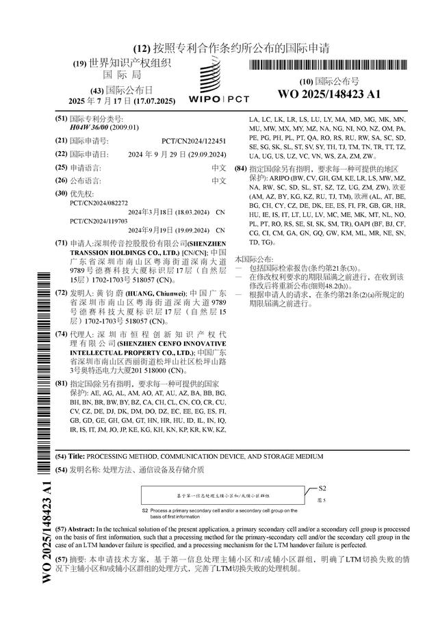 傳音控股披露“處理方法、通信設(shè)備及存儲介質(zhì)”國際專利申請