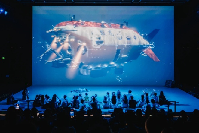 全新主題《蔚藍歸途》是聚焦深海的沉浸式作品,與中國深潛事業(yè)的最新成果“蛟龍?zhí)枴庇嘘P(guān)。創(chuàng)作團隊邀請到“蛟龍?zhí)枴备笨傇O(shè)計師崔維成教授擔(dān)任科學(xué)顧問,將萬米深潛的核心科研數(shù)據(jù)、海底地質(zhì)樣本分析、深潛器技術(shù)突破等第一手資料,轉(zhuǎn)化為可感知的視覺語言。觀眾在體驗中可以“跟隨”深潛器穿越馬里亞納海溝的漆黑深淵,看到發(fā)光生物的奇幻,也能感受中國深海探測從“跟跑”到“領(lǐng)跑”的科技進步。