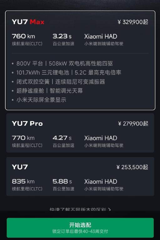 當(dāng)然,玩笑歸玩笑。我知道很多機(jī)友有實(shí)力沖小米 YU7 首發(fā),可每次心動(dòng)想下單時(shí),看到 App 顯示的「交付時(shí)間」,就瞬間冷靜了。標(biāo)準(zhǔn)版和 Pro 版動(dòng)不動(dòng)就得等 50 - 60 周,就算是價(jià)格最高的小米 YU7 Max,在排產(chǎn)提速的情況下,仍要等 40 - 43 周。
