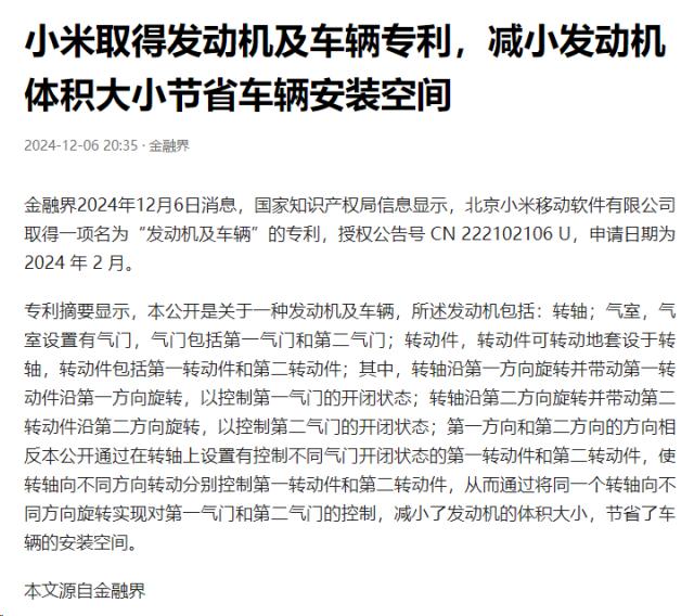早在 2023 年,小米就招聘增程系統(tǒng)設(shè)計(jì)開發(fā)工程師,網(wǎng)上還流傳一張小米員工招聘簡歷截圖,顯示該員工負(fù)責(zé)小米汽車首個(gè)混動(dòng)車型,對標(biāo)銷量靠前的車型,是公司后續(xù)銷量擔(dān)當(dāng),對成本性能要求高。此外,小米在 24 年底公布了一項(xiàng)發(fā)動(dòng)機(jī)專利,通過改進(jìn)減小發(fā)動(dòng)機(jī)體積和車輛安裝空間,前期準(zhǔn)備很充分。