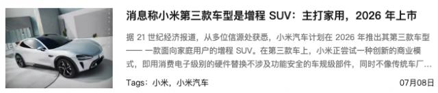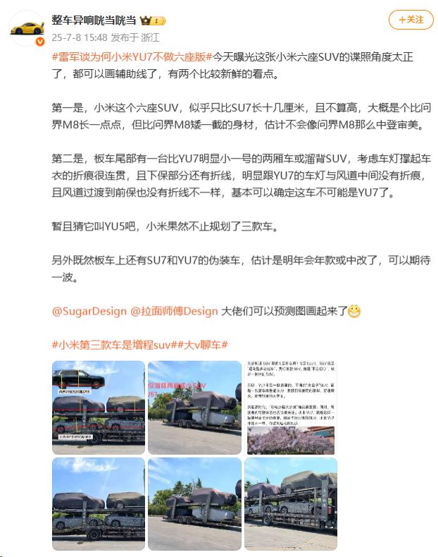 另一方面,繼小米 YU7 發(fā)布后,小米的第三臺車又有了“非官方爆料”。和去年爆料類似,小米的大型增程式 SUV 要來了。