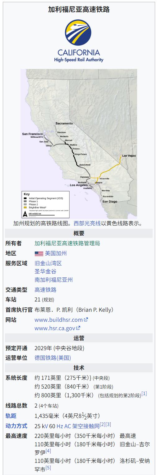 IT之家查詢公開資料獲悉,加利福尼亞高速鐵路(California High - Speed Rail)是美國(guó)加州興建中的高速鐵路系統(tǒng),全線行車速度設(shè)計(jì)為最高可達(dá)350 km/h,高速鐵路系統(tǒng)一期工程竣工后,將在三小時(shí)內(nèi)從舊金山直達(dá)洛杉磯盆地。該系統(tǒng)最終將延伸至薩克拉門托和圣地亞哥,全長(zhǎng)800英里(約1287公里),最多設(shè)有24個(gè)車站。