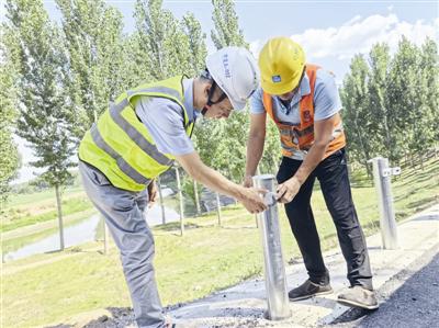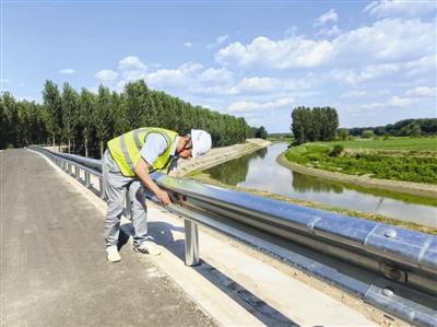項偉沿著河岸新修的道路俯身檢查波形護欄,用手觸摸護欄螺栓,目光審視著每一處細節(jié),“這批新到的構(gòu)件,安裝關(guān)一定要把好”。他走走停停,時而蹲下查看路肩基礎(chǔ),時而抬手示意工人調(diào)整材料堆放位置。