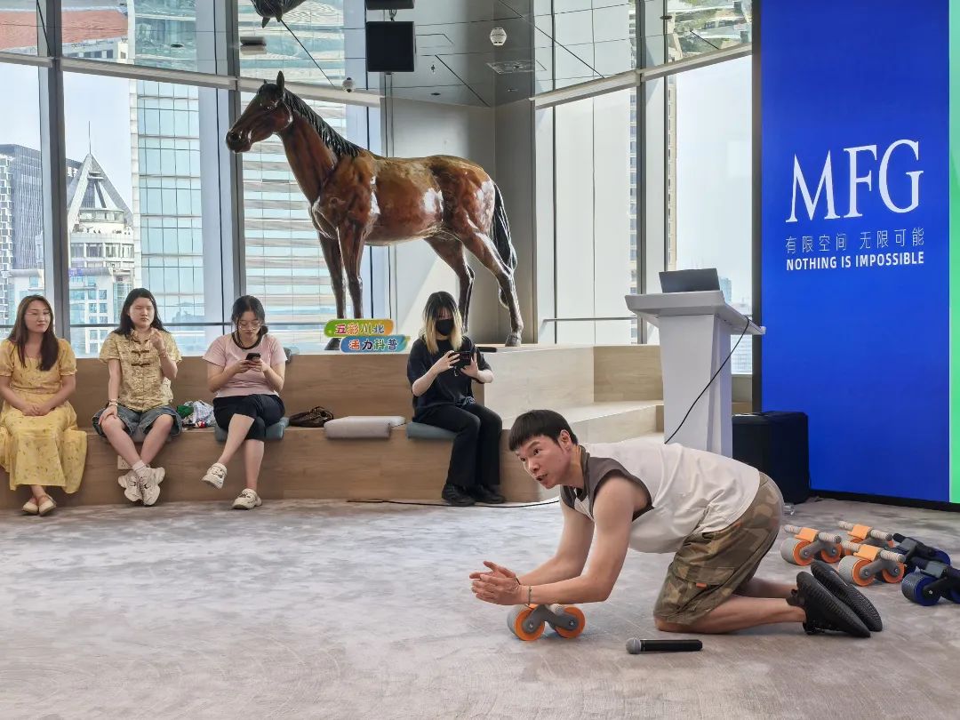 在健腹輪減脂實(shí)操環(huán)節(jié),教練先示范了標(biāo)準(zhǔn)動(dòng)作:雙手緊握健腹輪,收緊核心,緩慢推送時(shí)保持臀部穩(wěn)定、背部不塌陷,“感受腹部像收緊的彈簧,用核心力量帶動(dòng)身體回收”。當(dāng)白領(lǐng)上臺(tái)嘗試時(shí),教練在一旁細(xì)心糾正動(dòng)作細(xì)節(jié),“膝蓋別晃動(dòng),重心放穩(wěn)”“手臂放松,讓腹部主導(dǎo)發(fā)力”,手把手的指導(dǎo)讓參與者很快掌握了要領(lǐng),也讓臺(tái)下的白領(lǐng)們感受到了運(yùn)動(dòng)的樂趣。