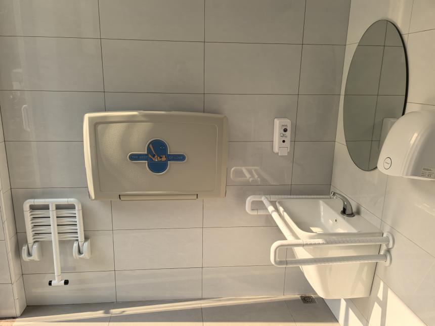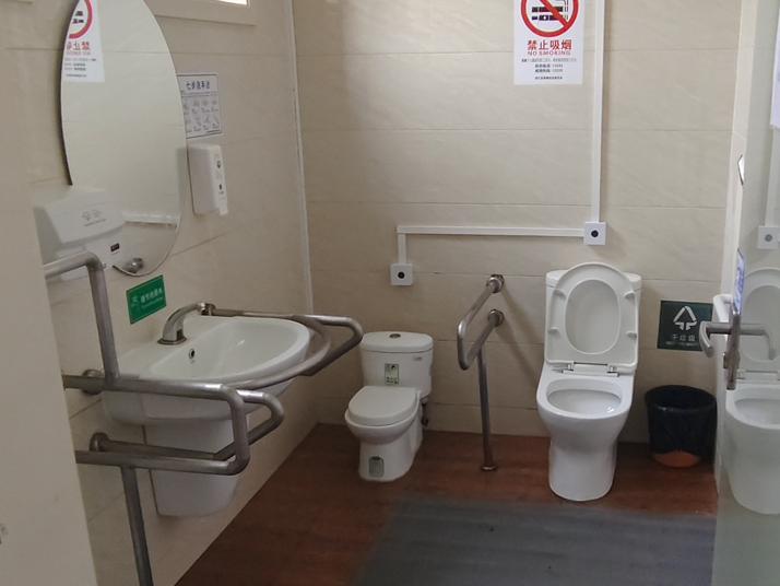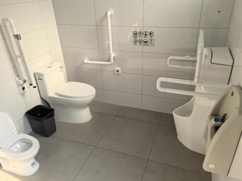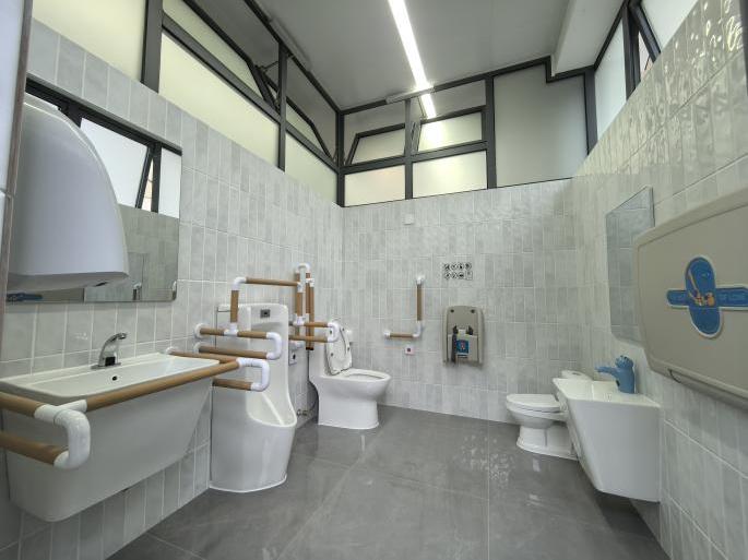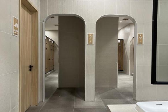 在改造過程中,區(qū)綠化市容局以“空間重構 + 功能升級”為雙輪驅動,推動公廁從“能用”向“好用”轉變。塘子涇公廁緊鄰學校與停車區(qū),改造前如廁高峰時常出現(xiàn)排隊“長龍”。通過釋放內部冗余空間、優(yōu)化布局,新增2個女廁位與1個男廁位,有效減少了市民如廁的等候時間。肇嘉浜路與襄陽南路公廁則重點關注特殊群體的需求:降低地坪層高,消除老人兒童通行障礙;優(yōu)化廁位比例,增設第三衛(wèi)生間,為殘障人士、母嬰等群體提供私密空間。