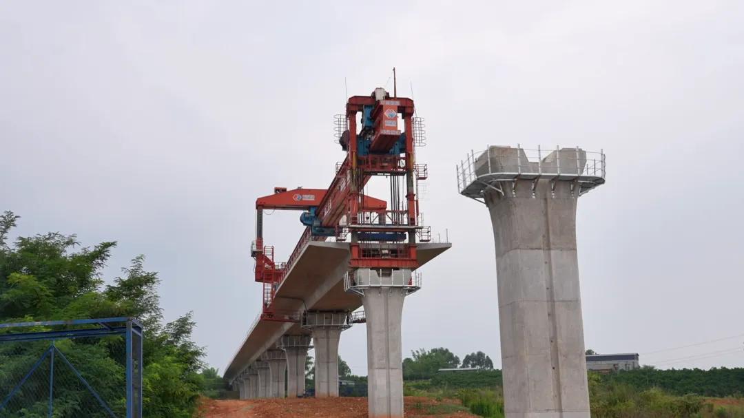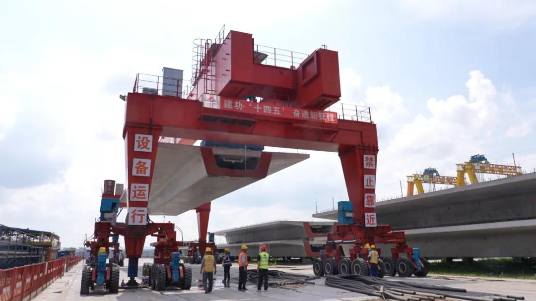近日,在成眉S5線岷東新區(qū)梁場至黑龍灘車站段,巨大的架橋機精準吊起預制箱梁,在施工人員的緊密配合下,箱梁穩(wěn)穩(wěn)落位。
