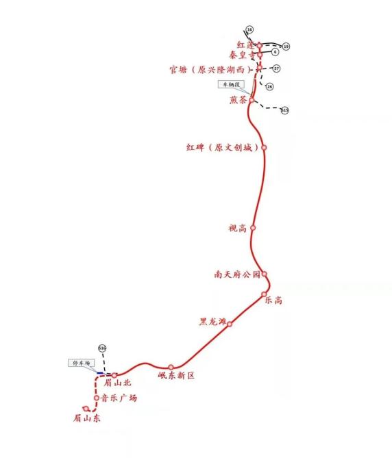 成眉S5線起于天府新區(qū)紅蓮站,止于眉山市眉山東站,途經(jīng)四川天府新區(qū)中央商務區(qū)、數(shù)字文創(chuàng)城片區(qū)、視高片區(qū)、黑龍灘片區(qū)、眉山市岷東新區(qū)、眉山市東坡區(qū),線路全長59.14公里,全線共13站14區(qū)間,地下站5座,高架站8座,采用最高運行速度160公里/小時的市域A型車,4輛編組。