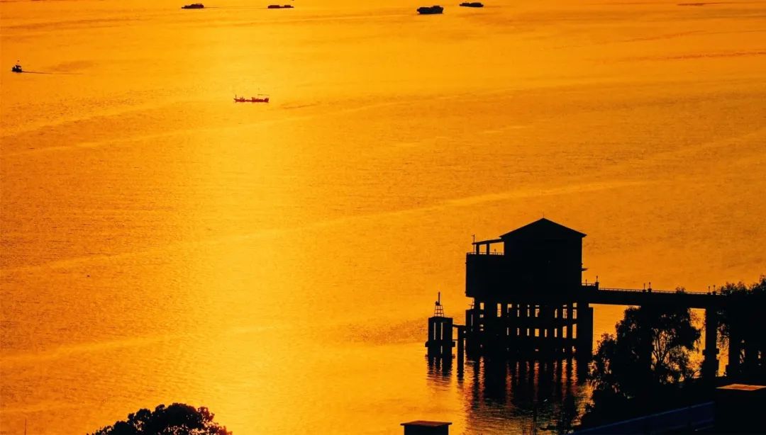 日落更是美不勝收。聞堰碼頭的輪渡載著晚風(fēng),將落日灑落在粼粼“橘子?!鄙?。