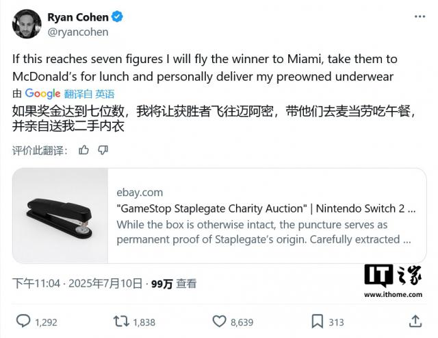 有意思的是,GameStop 把這次失誤變成了一次成功的公關(guān)案例。該公司決定將這臺(tái)訂書機(jī)與一臺(tái)新的 Switch 2 一起進(jìn)行拍賣,并把所得款項(xiàng)捐給兒童奇跡網(wǎng)絡(luò)醫(yī)院,最終成交價(jià)格為 25 萬美元。
