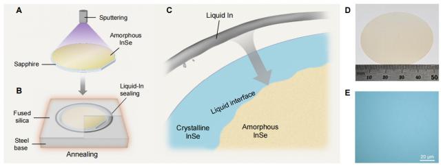 針對(duì)上述挑戰(zhàn),研究團(tuán)隊(duì)創(chuàng)新性地提出“固–液–固”二維 InSe 半導(dǎo)體制備策略,成功攻克了晶圓級(jí) InSe 材料純相、高質(zhì)量制備的關(guān)鍵難題。具體來說,研究團(tuán)隊(duì)先通過磁控濺射技術(shù),在藍(lán)寶石襯底上沉積非晶 InSe 薄膜,保證前驅(qū)體化學(xué)計(jì)量比為 1:1。接著,在高溫下(約 550 ℃),用低熔點(diǎn)液態(tài) In 包覆晶片邊緣,結(jié)合熔融石英構(gòu)建液封空間,防止成分揮發(fā)。此外,在液態(tài) In 高溫環(huán)境下,少量 In 原子進(jìn)入固態(tài) InSe 非晶薄膜,形成富 In 液態(tài)界面。在這個(gè)密閉反應(yīng)體系中,非晶 InSe 在富 In 液態(tài)界面發(fā)生溶解 - 再結(jié)晶過程,促進(jìn)高結(jié)晶度、純相 InSe 晶膜的形成。最終,團(tuán)隊(duì)制備出了厚度均勻、相結(jié)構(gòu)單一、晶體質(zhì)量優(yōu)異的 2 英寸 InSe 晶圓。