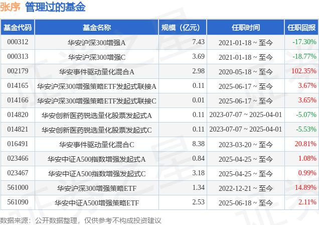 張序先生為中國國籍,擁有碩士研究生學歷,曾擔任瑞銀企業(yè)管理(上海)有限公司量化分析師。2017年2月加入華安基金,曾擔任指數與量化投資部基金經理助理,現任指數與量化投資部基金經理。他在2020年5月18日起擔任華安事件驅動量化策略混合型證券投資基金基金經理;2021年1月18日起任華安滬深300量化增強證券投資基金基金經理;2022年12月起擔任華安滬深300增強策略交易型開放式指數證券投資基金的基金經理;2023年7月至2025年3月擔任華安創(chuàng)新醫(yī)藥銳選量化股票型發(fā)起式證券投資基金的基金經理。