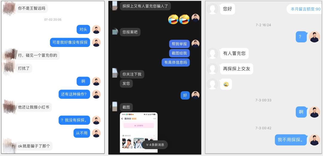 最初,我在小紅書上收到一條私信,有人告知我,有人用我的信息在探探上冒充我去相親。