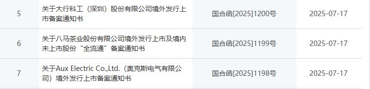 7月17日,證監(jiān)會一連披露多則備案通知書,包括《關(guān)于大行科工(深圳)股份有限公司境外發(fā)行上市備案通知書》《關(guān)于八馬茶業(yè)股份有限公司境外發(fā)行上市及境內(nèi)未上市股份“全流通”備案通知書》《關(guān)于Aux Electric Co.,Ltd.(奧克斯電氣有限公司)境外發(fā)行上市備案通知書》。
