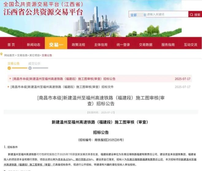 公告顯示,新建溫州至福州高速鐵路可行性研究報告已于2025年7月獲國家發(fā)展改革委批復。