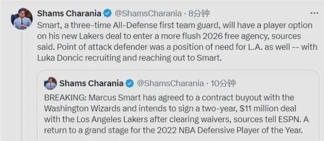 太瘋狂了!湖人又完成了一筆重磅簽約,成功拿下NBA最佳防守球員。據(jù)爆料王Shams消息,斯瑪特與奇才達(dá)成買斷協(xié)議,計(jì)劃在度過(guò)澄清期后,以兩年1100萬(wàn)美元的合同加盟湖人。若沒(méi)有買斷,斯瑪特在25 - 26賽季的全額薪水原本能達(dá)到2134萬(wàn)美元。