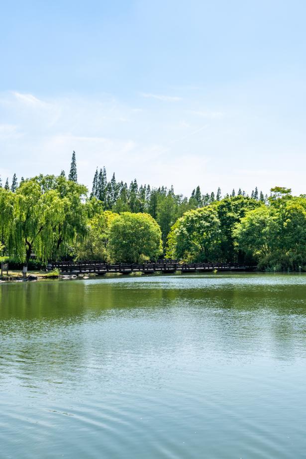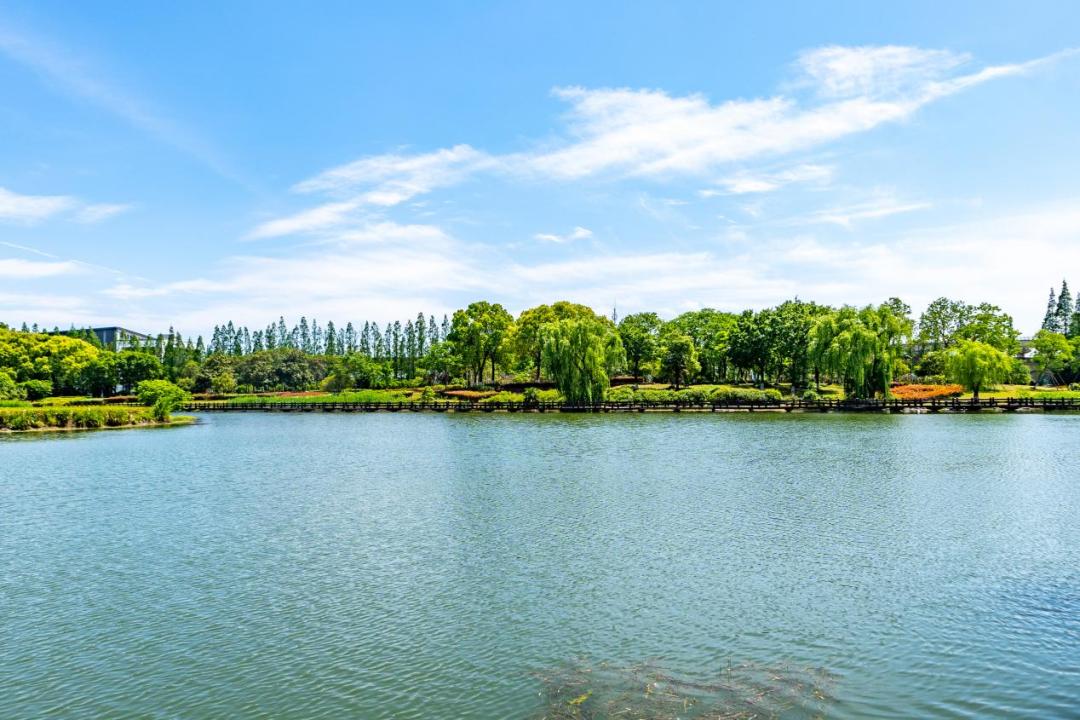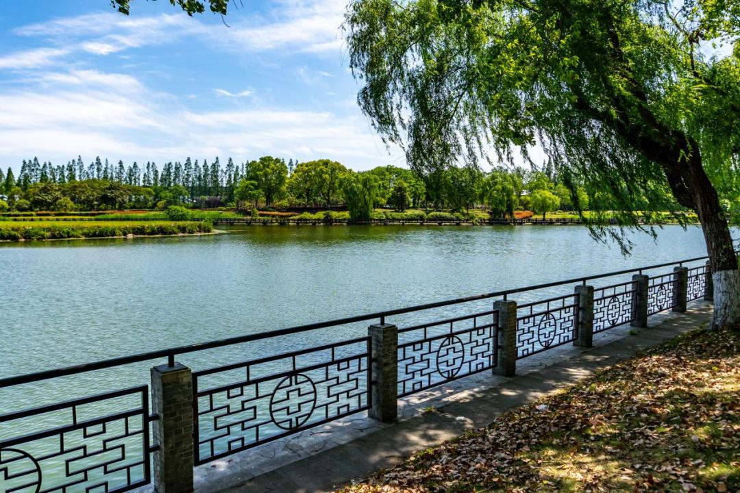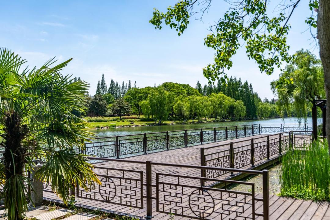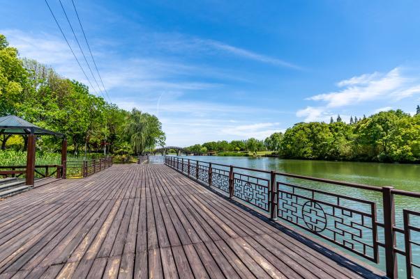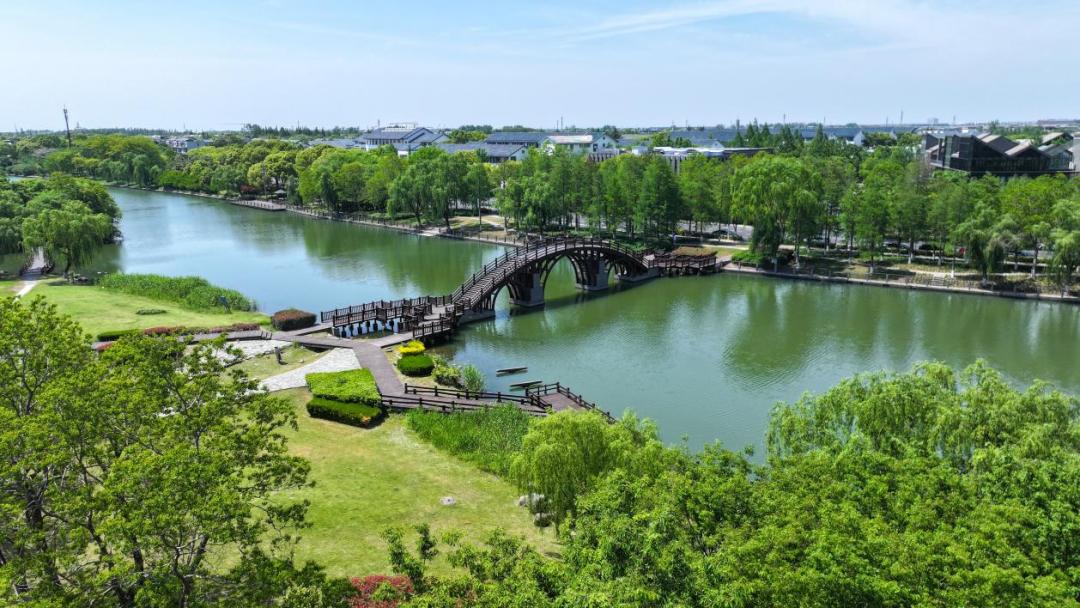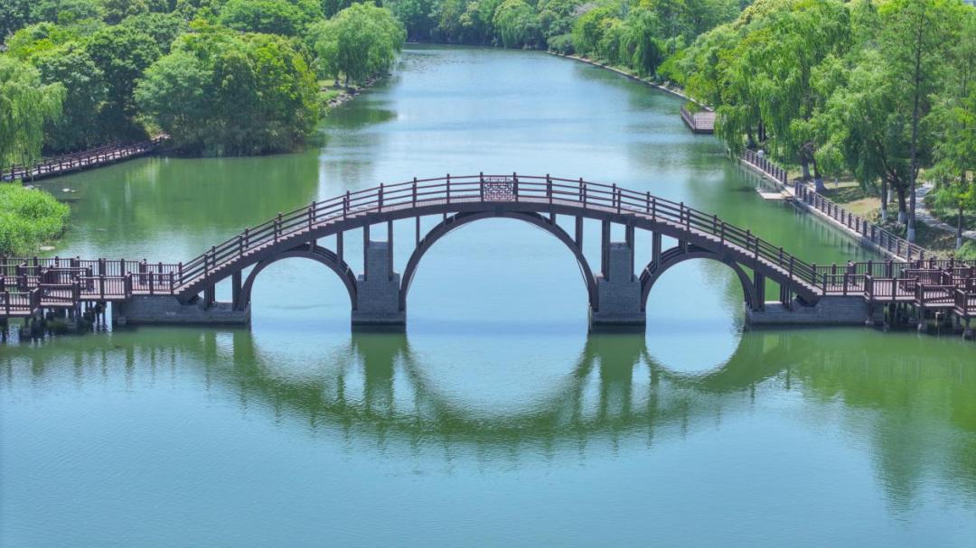 廊橋觀瀾之途:登上南大港上的仿古景觀橋,看碧水如美玉,俯瞰游船劃過(guò)波光粼粼的水面,還能看到17號(hào)線列車(chē)在綠野中穿行的畫(huà)面。