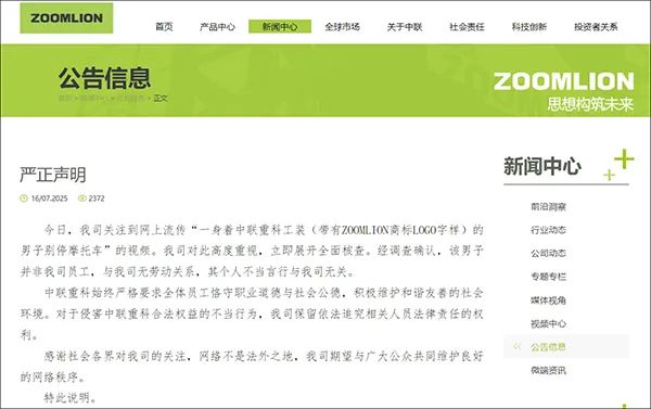 7月16日,中聯(lián)重科股份有限公司網(wǎng)站發(fā)布嚴(yán)正聲明。聲明稱,公司關(guān)注到網(wǎng)上流傳“一身著中聯(lián)重科工裝(帶有ZOOMLION商標(biāo)LOGO字樣)的男子別停摩托車”的視頻,高度重視并立即展開全面核查。經(jīng)調(diào)查確認(rèn),該男子并非公司員工,與公司無勞動(dòng)關(guān)系,其個(gè)人不當(dāng)言行與公司無關(guān)。