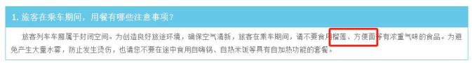 記者查詢中國鐵路12306官網(wǎng)發(fā)現(xiàn),出行指南的注意事項里明確指出:由于旅客列車車廂屬于封閉空間,為確保旅途環(huán)境良好和空氣清新,乘車期間請勿食用榴蓮、方便面等氣味濃重的食品。
