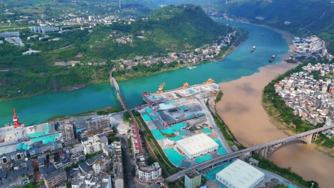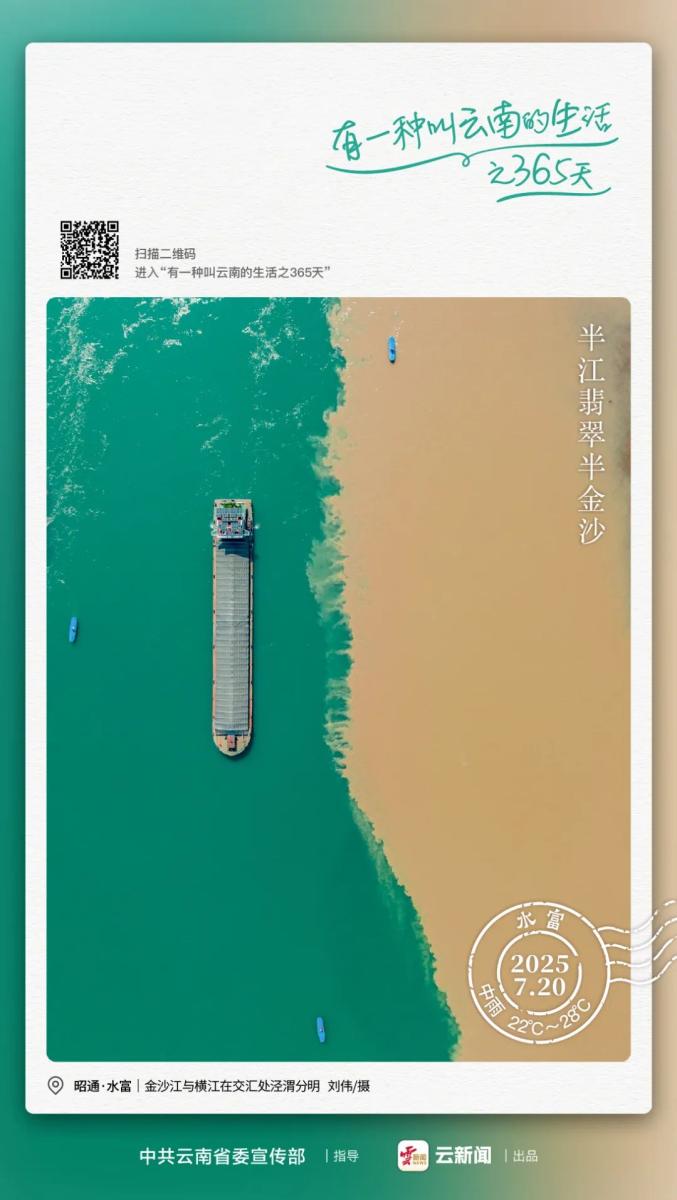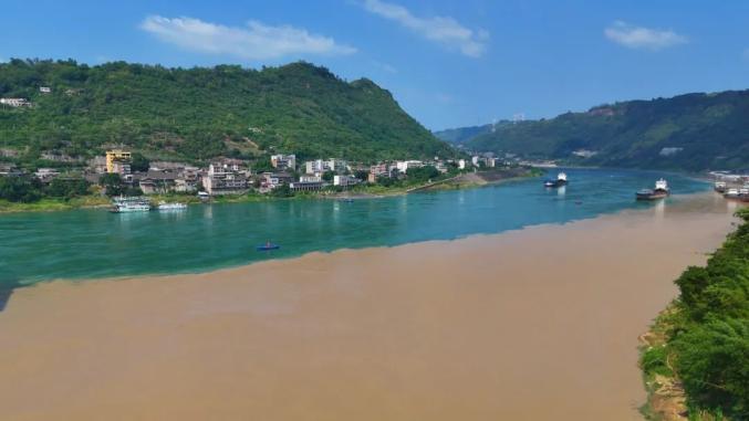 正值汛期,金沙江如翡翠綢緞般清澈溫潤,橫江裹著泥沙奔涌向前。一清一濁兩江相遇,劃出清晰界線,青黃兩色水域并肩流淌又緩緩相融,與蒼翠群山、藍(lán)天白云構(gòu)成一幅天然油畫。